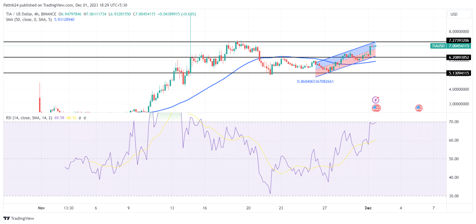 La media móvil (MA) de 50 días está en 5,97 dólares, lo que indica una tendencia alcista. El índice de fuerza relativa (RSI) se sitúa en 70, lo que refleja un alto sentimiento alcista, aunque la presión de venta podría desencadenar una ligera desaceleración. Celestia (TIA) tenía un precio de 7,03 dólares, TIA ha experimentado un notable aumento del 9,84% en las últimas 24 horas y un aumento significativo del 24,57% en los últimos 7 días.
