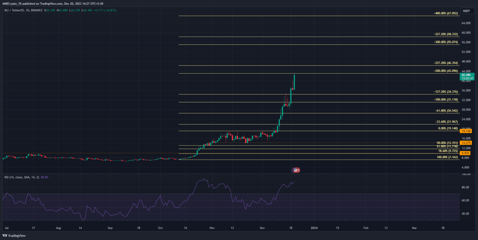 inyectivo [INJ] se ha recuperado un 500% y contando desde el 12 de octubre. El análisis técnico del token mostró que había cielos despejados por encima de $25, y en este momento $55 era una gran probabilidad.