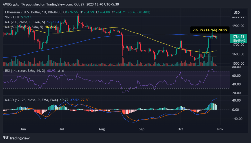 En el momento de escribir este artículo, Ethereum cotizaba por encima del nivel de precio de 1.780 dólares, con una ganancia de menos del 1%. Además, las recientes caídas consecutivas han llevado su índice de fuerza relativa (RSI) por debajo de 70.