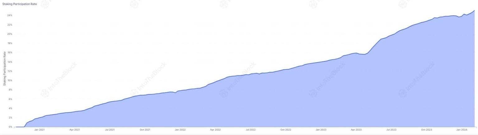 Según la firma de investigación en cadena IntotheBlock, la tasa de participación en apuestas de Ethereum superó recientemente el 25%, lo que significa que alrededor de una cuarta parte del suministro circulante de ETH estaba bloqueado en la red.