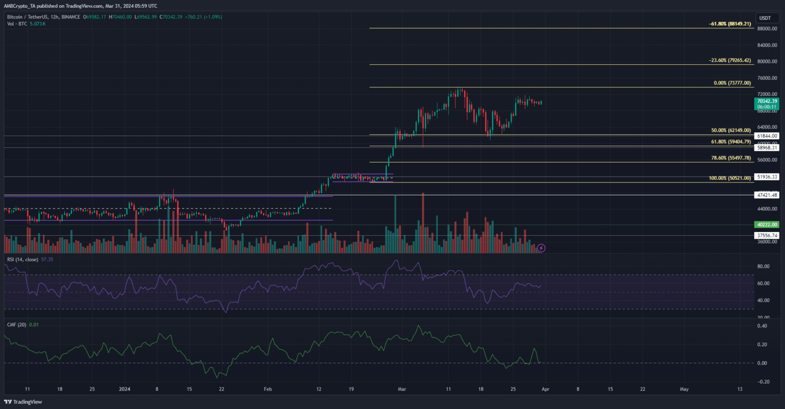 Los niveles de retroceso de Fibonacci trazados para el repunte de 50,5 mil dólares a 73,7 mil dólares mostraron que el nivel de retroceso del 50% se probó como soporte a mediados de marzo.