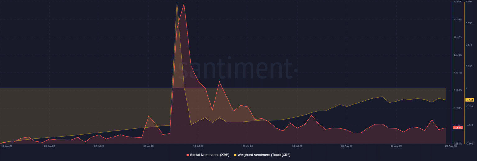 Al momento de escribir este artículo, el sentimiento ponderado de XRP era -0,144. Esto sugirió que una gran parte de la comunidad criptográfica no estaba entusiasmada con la acción del precio a corto plazo del token.