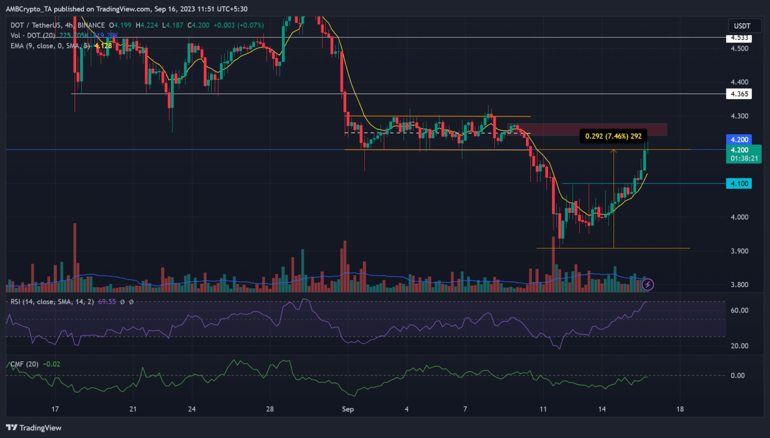 Lunares [DOT] Los traders swing que captaron el cambio de tendencia alrededor del 12 de septiembre subieron un 5% al momento de esta publicación. La altcoin nativa parachain se cotizaba a 4,2 dólares, frente a la reciente caída de 3,9 dólares, pero alcanzó un rango mínimo que podría tentar a los vendedores a buscar el reingreso.