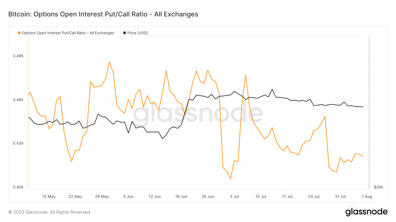 Otra métrica esencial es la relación Put/Call del volumen de opciones de Bitcoin, que mide el volumen de negociación de las opciones de venta frente a las opciones de compra. A diferencia de la relación abierta de venta/compra, la relación de volumen experimentó una caída similar el 27 de julio, pero desde entonces se recuperó, experimentando un aumento del 64%.