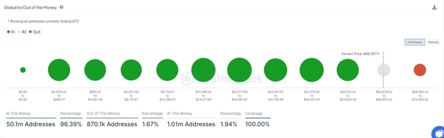 Para volver al punto en el que la rentabilidad de Bitcoin volverá a la marca del 100%, el precio tendrá que volver a probar el rango de $68.992,54 a $72.500,92. Como mostraron los datos de IntoTheBlock, más de 870.000 direcciones acumularon hasta 877.770 BTC, lo que sitúa este rango como el punto de resistencia final.