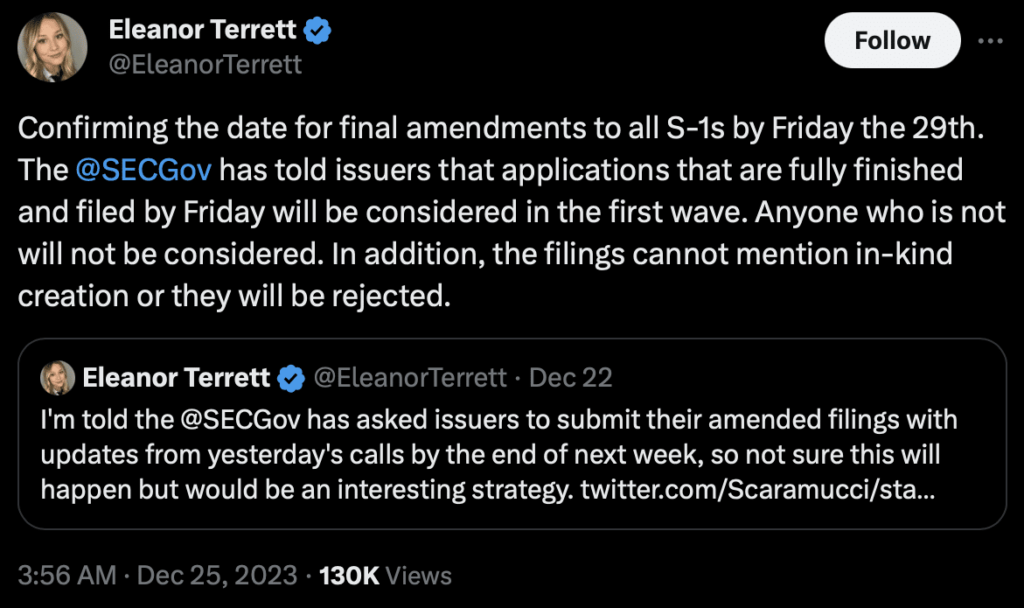 Después de demorarse durante meses en la aprobación de un ETF al contado de Bitcoin, la Comisión de Bolsa y Valores de EE. UU. (SEC) ha dicho a los aspirantes a ETF que realicen los cambios finales en sus solicitudes antes del 29 de diciembre de 2023. La periodista de Fox Business, Eleanor Terrett, dio la noticia el X (anteriormente Twitter) el lunes.