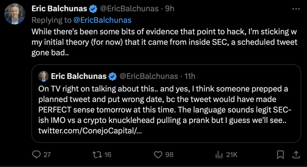 Una sección de la comunidad criptográfica cree que la propia SEC es la culpable del fiasco, así como de la agitación en el mercado criptográfico que siguió. Eric Balchunas, analista senior de ETF de Bloomberg, se dirigió a X, la plataforma de redes sociales anteriormente conocida como Twitter, y dijo que la SEC estaba detrás de toda la confusión. Según Balchunas, se trató de “un tuit programado que salió mal”.