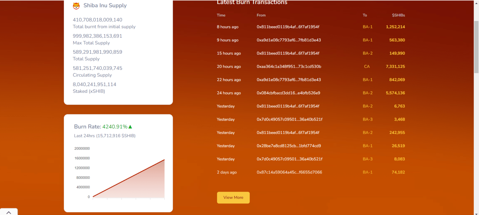 En una exhibición ardiente, SHIB, un actor destacado en el ámbito de las monedas meme, ha sido testigo de un aumento sorprendente en la tasa de quema de Shiba Inu, superando las expectativas y dejando un rastro de más de 410,7 billones de tokens SHIB incinerados de su suministro máximo. En particular, este aumento, un impresionante aumento del 4200 %, ha puesto a Shiba Inu en el centro de atención, atrayendo la atención tanto de los entusiastas de las criptomonedas como de los analistas financieros. En otras palabras, el ardiente frenesí de las últimas 24 horas ha creado ondas en el mercado de las criptomonedas.