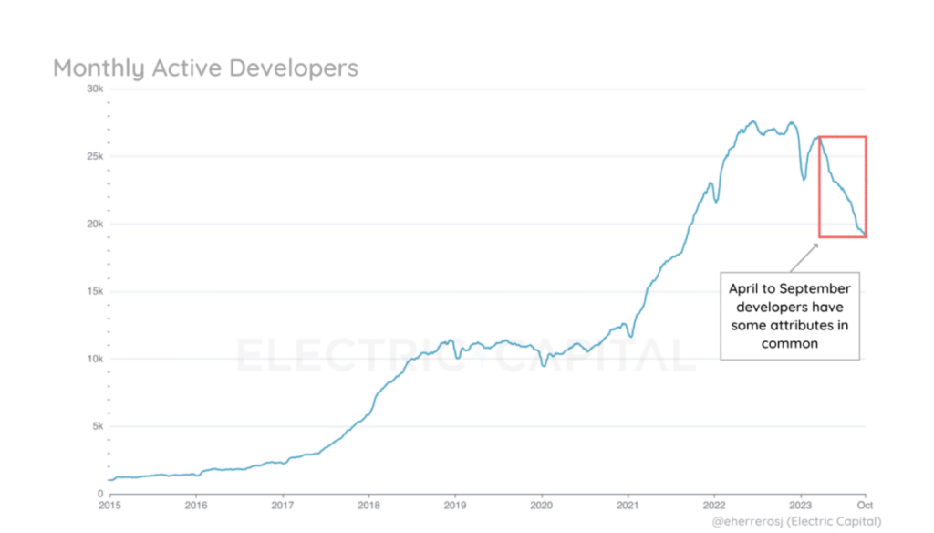 Sin embargo, los datos proporcionados por el Developer Report, rastreador de desarrollo de blockchain de Electric Capital, cuentan una historia diferente. Según el informe, sólo 946 desarrolladores estaban construyendo en Solana en octubre del año pasado. Eso es menos de la mitad del recuento de desarrolladores de 2634 informado en diciembre de 2022, el más alto en la historia de Solana.