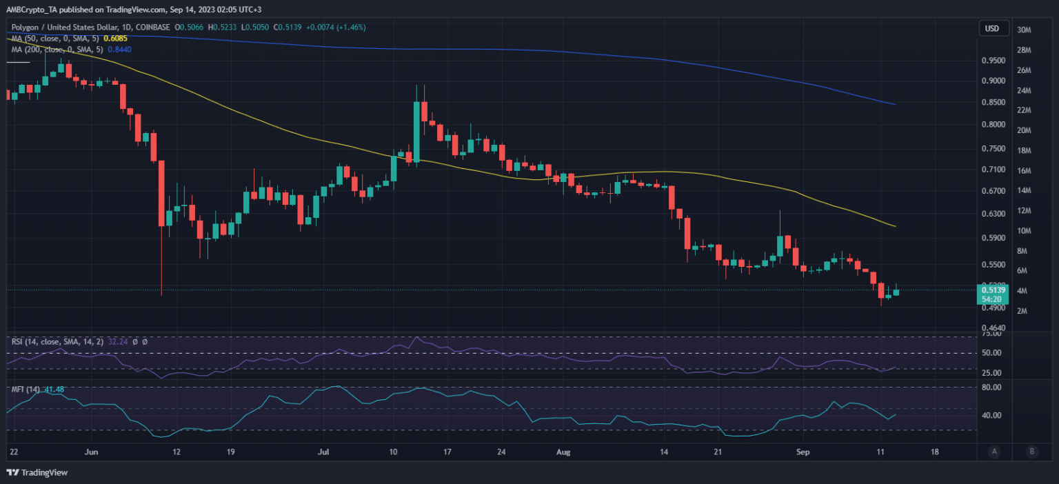 Si bien los esfuerzos de Polygon resaltan un movimiento hacia facilitar la adopción masiva y el éxodo a la cadena de bloques, su token nativo también se encontraba en un punto crucial. MATIC ha sido bastante bajista en las últimas semanas y recientemente cayó por debajo de sus mínimos de junio de 2023. En otras palabras, ahora tiene un nuevo mínimo hasta la fecha de 0,49 dólares alcanzado el lunes (11 de septiembre).