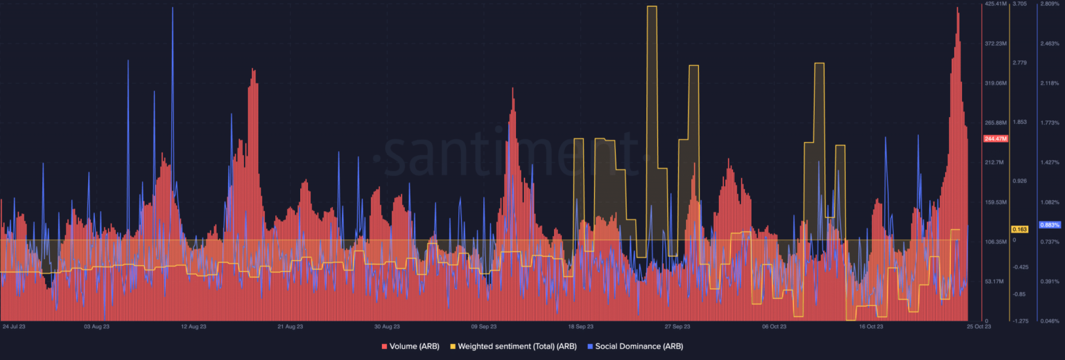 Además, la recuperación en el frente del dominio social fue la confirmación de que la confianza de los inversores en las altcoins estaba recuperando su supremacía. Además, lo que destacó fue el volumen de la ARB, especialmente durante los últimos dos días.