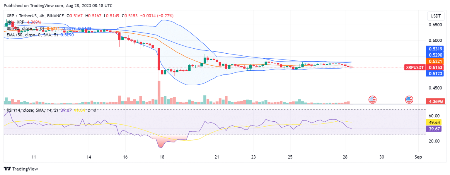 El precio de XRP actualmente cotiza a 0,51 dólares, un 2% menos en las últimas 24 horas. El mínimo y el máximo de 24 horas son 0,515 dólares y 0,529 dólares, respectivamente. Sin embargo, la acción general del precio es lateral y el volumen de operaciones ha disminuido significativamente en la última semana.