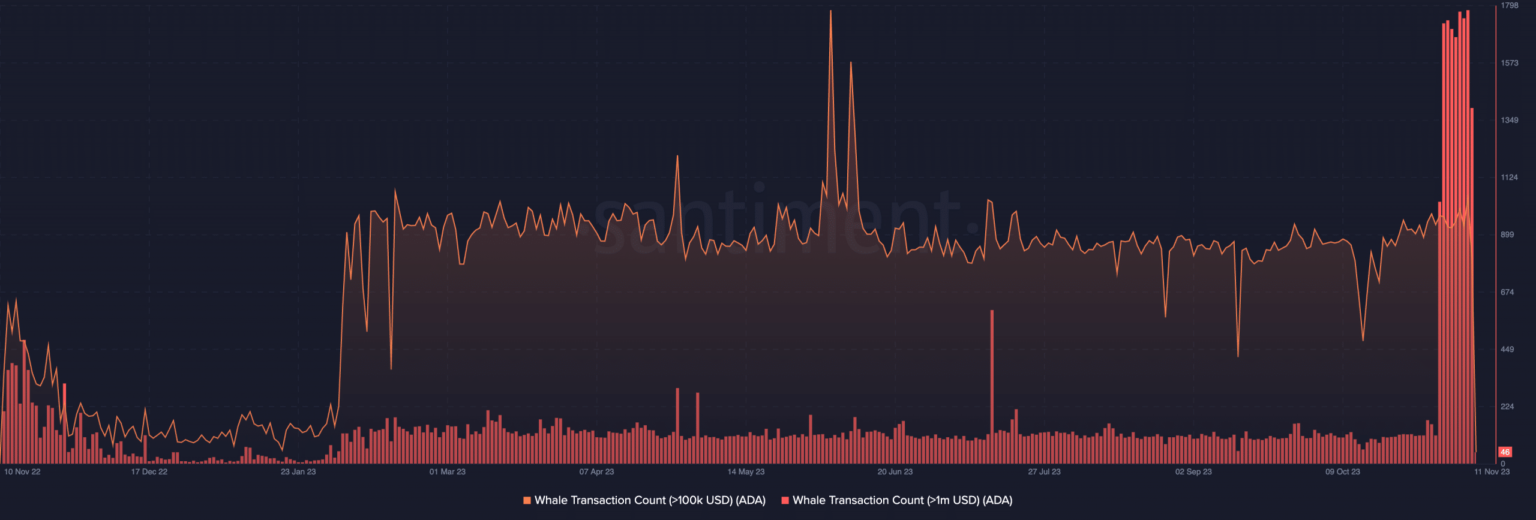 El 9 de noviembre, el número de transacciones ADA superiores a 1 millón de dólares ascendía a 2192. Del mismo modo, ADA registró su recuento de transacciones diarias más alto en los últimos seis meses para transacciones que superaron los $100,000.
