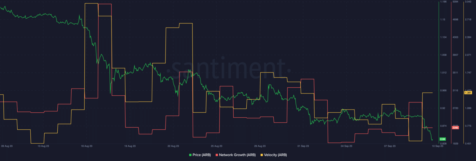 Las repercusiones del cada vez menor interés por parte de las ballenas fueron evidentes considerando el precio de mercado de ARB, que se situó en 0,836 dólares. Además, tanto la tasa de crecimiento de la red como la velocidad de las transacciones experimentaron una disminución durante el último mes, lo que indica desafíos potenciales para ARB.