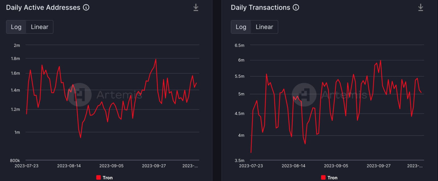 Este aumento en el uso de monedas estables también llevó a un aumento en la cantidad de direcciones activas diarias en la red Tron. Según los datos de Artemis, el recuento aumentó de 1,34 millones a 1,48 millones durante el mes pasado.