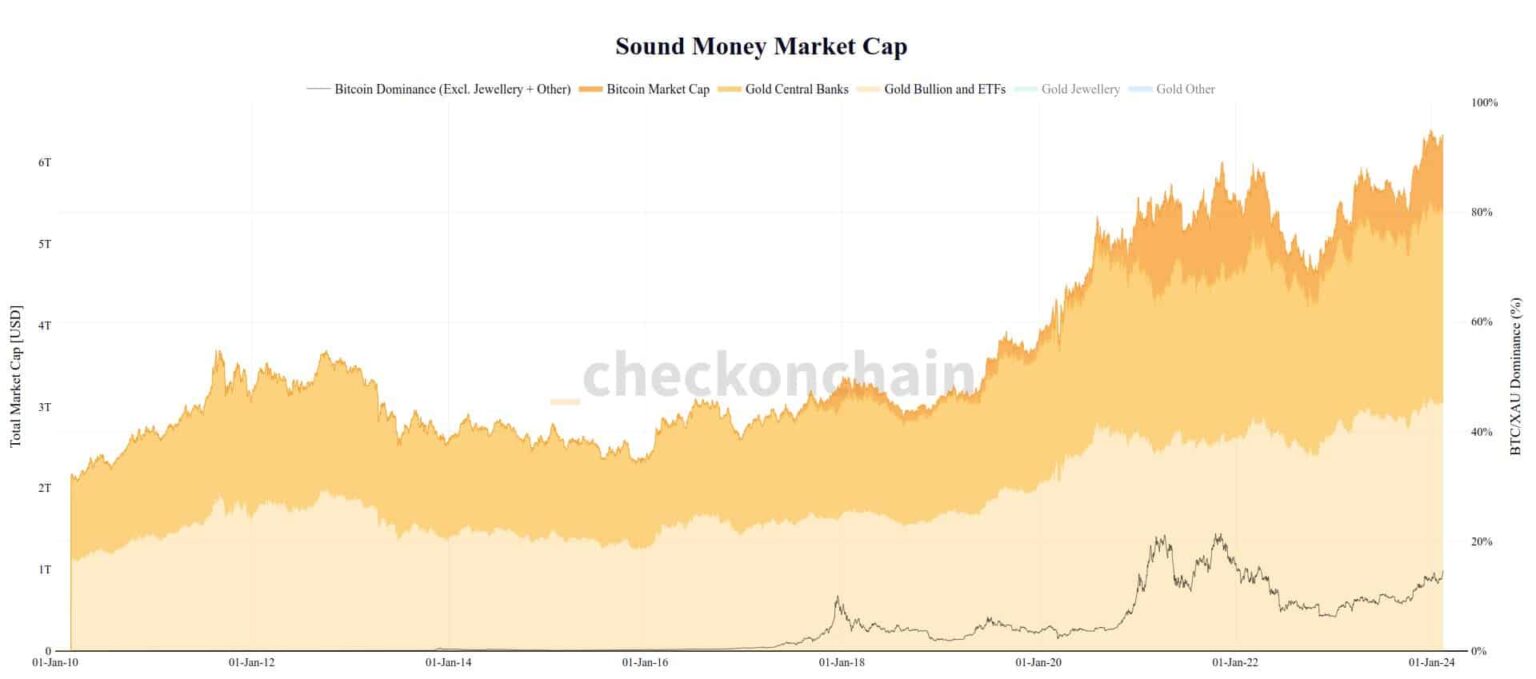 Sin embargo, el análisis de Checkmate indica que la presencia de Bitcoin en esta sólida capitalización del mercado monetario con grado de inversión se está expandiendo rápidamente. La trayectoria de crecimiento de BTC, que actualmente representa el 15% de la capitalización de mercado total con grado de inversión, sugiere un futuro prometedor en el ámbito de los activos monetarios sólidos.
