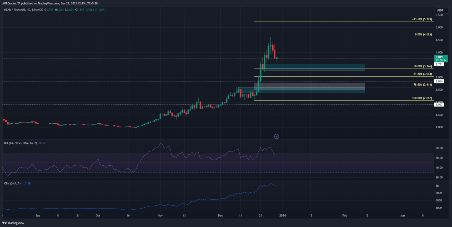 Cerca del protocolo [NEAR] El valor de su token se disparó en los últimos dos meses, ganando un 300% del 20 de octubre al 26 de diciembre. Desde entonces, los precios han bajado un poco. Sin embargo, se mantuvo el sesgo alcista en el marco temporal más alto.