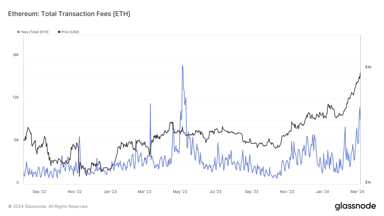 Según el cuadro de nodo de vidrio, las tarifas a principios de mes eran de aproximadamente 6.300 ETH. Al momento de escribir este artículo, las tarifas han aumentado a más de 9,000 ETH, lo que marca el rango más alto observado en más de diez meses.
