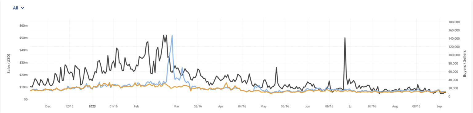 Sin embargo, desde febrero, esta tendencia ha tenido una tendencia a la baja. Con 143,06 millones de dólares registrados en septiembre, el volumen de ventas de NFT en la red se ha desplomado un 85% en los últimos nueve meses.