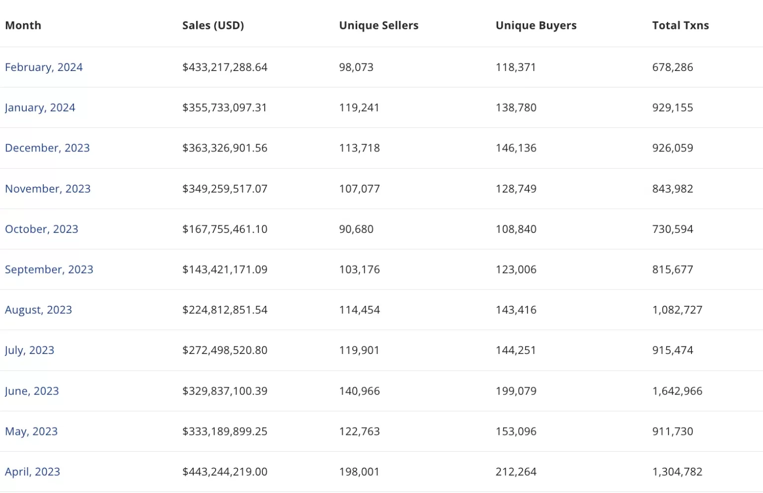 Según el proveedor de datos, la última vez que el volumen de ventas mensuales de NFT en la red Ethereum superó los 400 millones de dólares fue en abril de 2023.