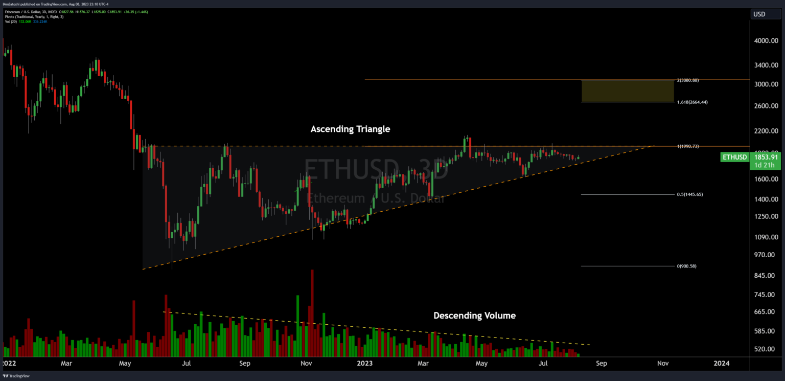 Olszewicz comienza destacando el patrón de precios actual de Ethereum, afirmando en broma: “Ethereum: triángulo ascendente 450 millones de años en desarrollo con extensiones de fib a $ 3k”. Este triángulo ascendente, caracterizado por una parte superior plana y una parte inferior ascendente, se ha estado formando desde mayo de 2022, y si la historia sirve de guía, podría ser una señal alcista para Ethereum.