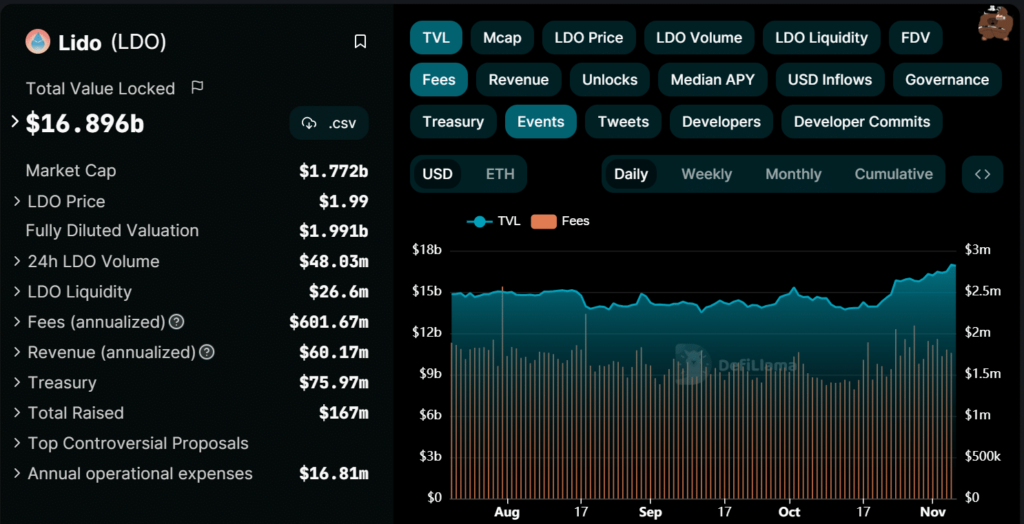 Además, un examen del gráfico de valor total bloqueado (TVL) en la red mostró una mayor actividad. Entre octubre y noviembre, el TVL había aumentado más de 2.000 millones de dólares. Además, en el momento de escribir este artículo, la cifra superaba los 16.800 millones de dólares.