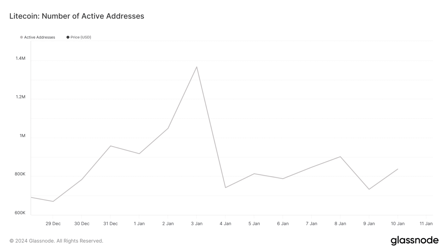 A modo de contexto, a partir del 1 de enero, se crearon 1,20 millones de nuevas direcciones en Litecoin. El 10 de enero, cayó a 688.000.
