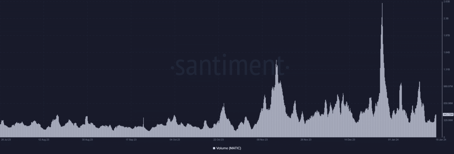Los datos de Santiment mostraron una disminución en el volumen de MATIC. El volumen, que inicialmente superó los 800 millones de dólares el 11 de enero, cayó posteriormente a unos 313 millones de dólares el 17 de enero.