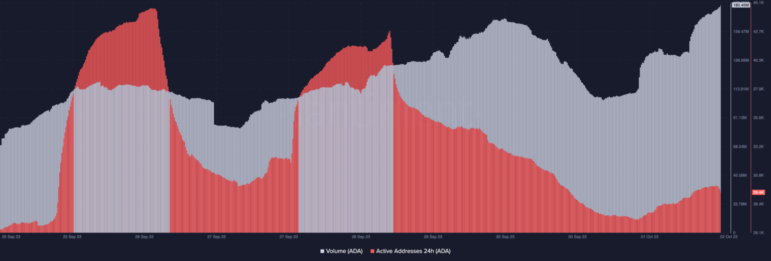 Al momento de escribir este artículo, la ADA volumen fue de 180,45 millones, el nivel más alto registrado en la última semana. Este aumento indica un alto nivel de especulación en torno al token. En cadena datos También mostró que la actividad de la red aumentó varias veces durante la semana.