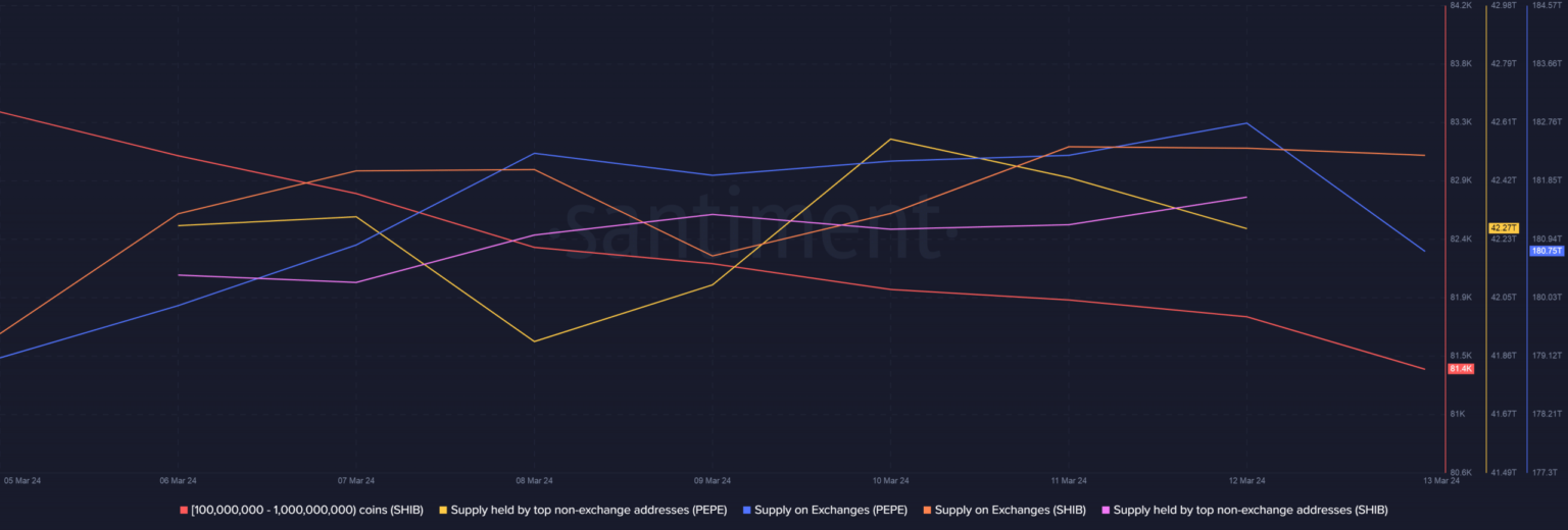 Según los datos obtenidos de Santiment, el suministro de las principales carteras de Pepe cayó desde el comienzo de la semana. Por el contrario, la oferta de ballenas SHIB aumentó al mismo tiempo.