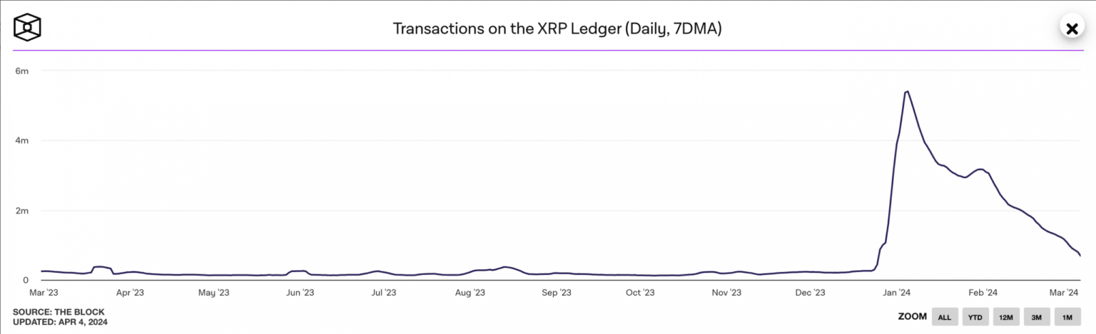 Según el panel de datos de The Block, el recuento diario de transacciones completadas en XRPL ha disminuido desde el 4 de enero. En un promedio móvil de siete días, el recuento de transacciones diarias de la red cayó un 87% entre enero y marzo.