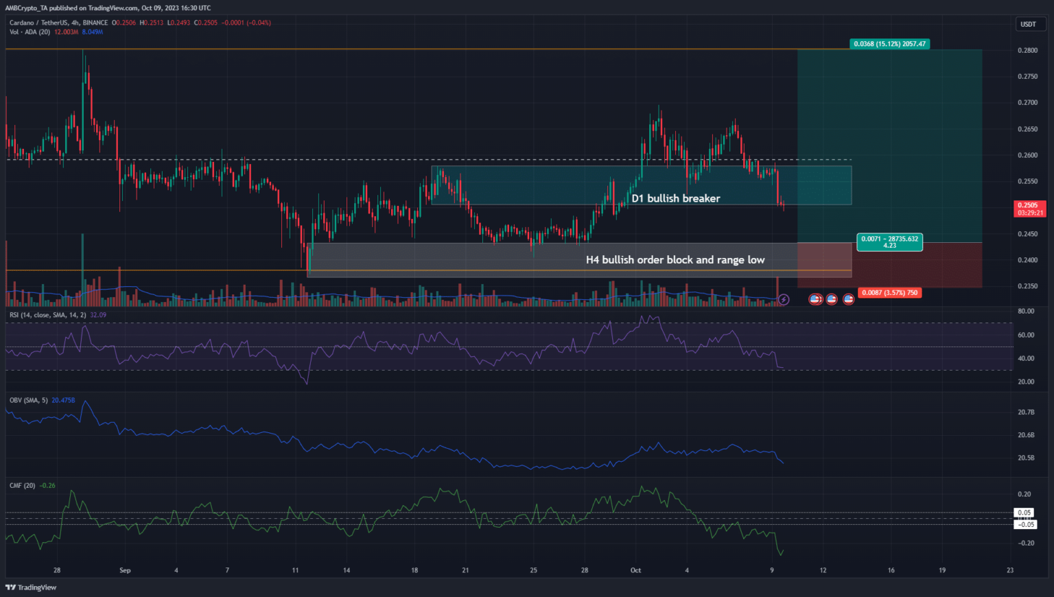 El análisis de Cardano de AMBCrypto con fecha del 6 de octubre destacó que 0,25 dólares era un nivel de compra clave. También subrayó la resistencia de $ 0,28 como la que deben batir los alcistas de la ADA. En el momento de esta publicación, los compradores estaban luchando por mantener los precios por encima del nivel de 0,25 dólares. ¿Deberían los comerciantes intentar vender el token en corto?