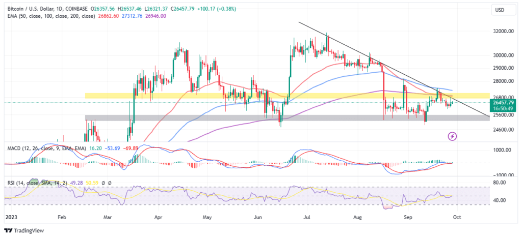El precio de Bitcoin ronda los $ 26,000 mientras tanto los alcistas como los bajistas ejercen su control en medio de una avalancha de noticias sobre los fondos cotizados en bolsa (ETF) de Ethereum y BTC. La criptomoneda más grande cotiza ligeramente por encima de los 26.400 dólares el jueves, un aumento del 0,5% en 24 horas, con un volumen de operaciones de 14.800 millones de dólares.
