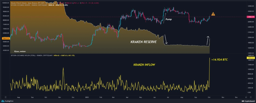Según los datos en cadena de Crypto Quant, se registró una afluencia masiva de BTC en el intercambio, lo que indica especulaciones sobre un posible entorno alcista para la principal criptomoneda. Se produjo una enorme entrada de 14.924 Bitcoin. registrado en el intercambio, que fue el mayor registrado en Kraken desde 2018. Las entradas de divisas en grandes volúmenes están históricamente asociadas con picos de precios de Bitcoin en el futuro cercano. Por lo tanto, el hito de los 30.000 dólares, si se supera, podría servir como un impulso psicológico para la siguiente etapa del repunte.