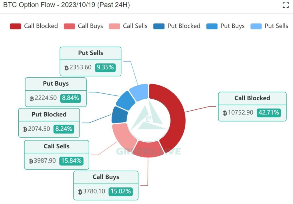 Además, los datos de opciones de Bitcoin muestran que los precios largos de BTC están ganando fuerza. Los datos del mercado de opciones indican una creciente confianza en los aumentos de precios de Bitcoin a largo plazo. Hoy, se negociaron más de 10,000 opciones de compra en bloque de BTC. Tiene un valor combinado de casi 300 millones de dólares, lo que representa más del 40% de la actividad total de opciones del día. La estrategia dominante implicó vender BTC-3NOV23-29000-C y comprar BTC-29DEC23-34000-C con un diferencial diagonal, según los datos compartidos por GreeksLive.