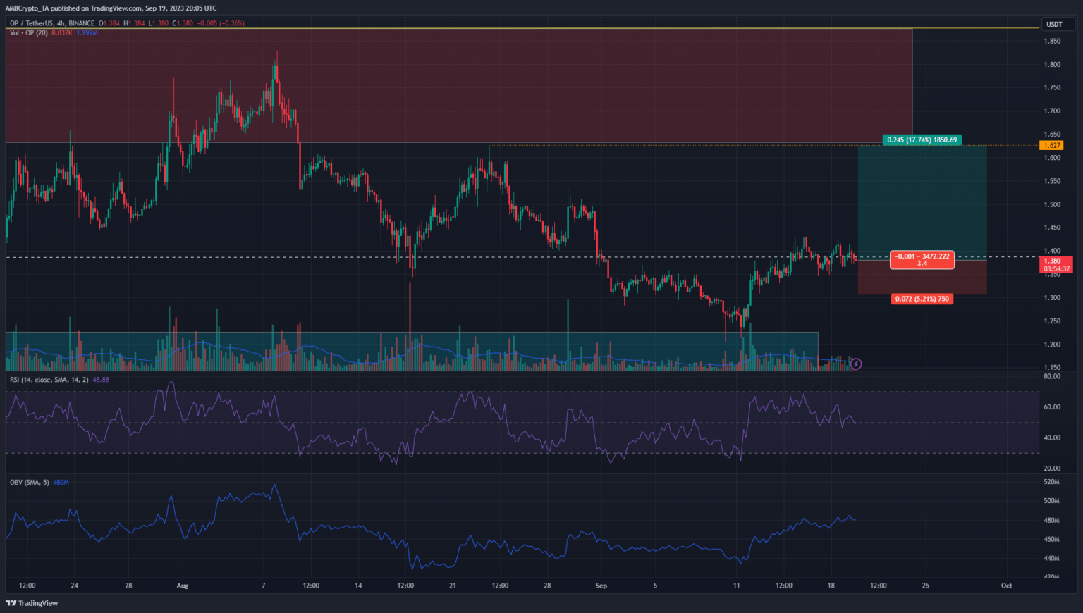 Optimismo [OP] tiene una perspectiva bajista en el gráfico de un día pero alcista en el gráfico de cuatro horas. La defensa de la zona de soporte de 1,2 dólares por parte de los compradores ha sido impresionante durante la semana pasada, ya que OP ganó más del 10%.