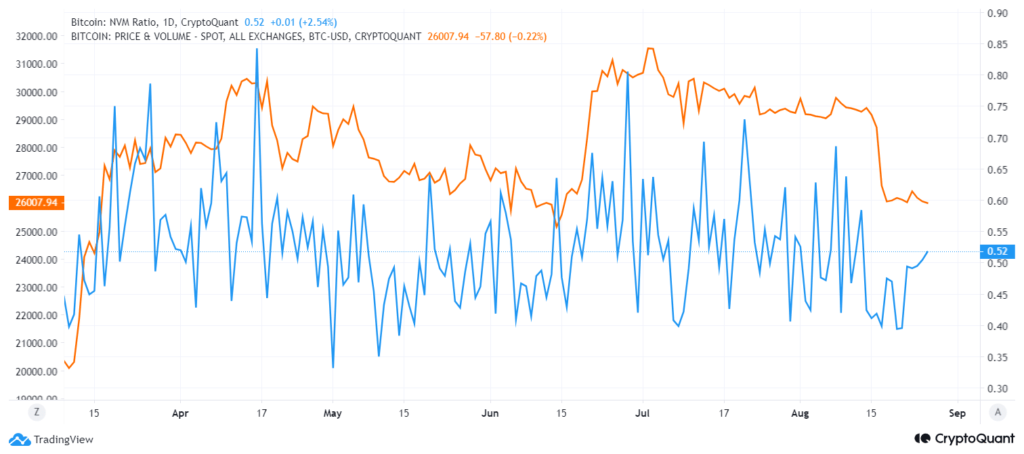 El ratio NVM de Bitcoin ha aumentado recientemente a 0,52, cayendo por debajo del umbral de 0,6 que normalmente indica una subvaluación. El “relación NVM” es una medida que examina la correlación entre el logaritmo del valor de mercado de Bitcoin y el cuadrado de sus usuarios activos diarios.