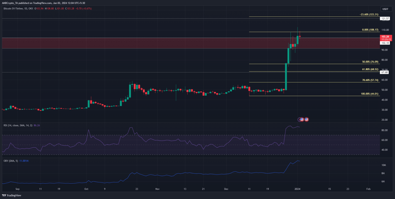 Bitcoin SV [BSV] ha registrado excelentes ganancias durante la semana pasada. Cotizó a 44 dólares el 11 de diciembre y subió a 108 dólares el 29 de diciembre. Este movimiento midió 145,8%. Además de eso, también se rompió una zona de resistencia semanal.