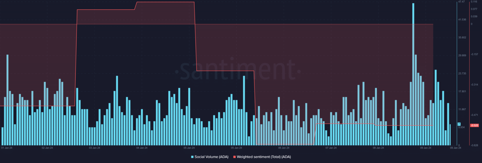 Fue sorprendente ver que a pesar del aumento de precios, el sentimiento ponderado de ADA continuó siendo bajo, lo que significa que el sentimiento bajista dominaba en el mercado.