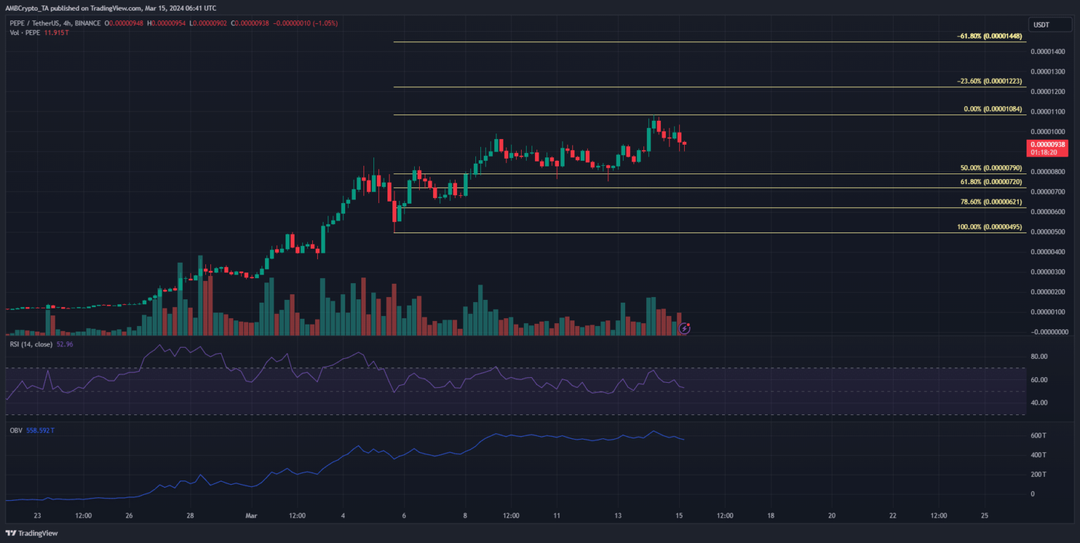 Desde el 14 de marzo, el OI ha comenzado a bajar. Durante ese tiempo, el precio del PEPE disminuyó más del 10%. La caída de los precios y la OI pusieron de relieve un cambio en la convicción a corto plazo.