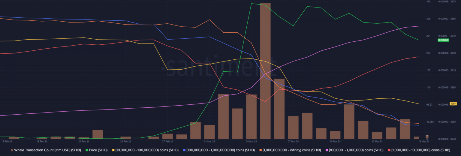 Curiosamente, las carteras SHIB que contienen más de 10 millones de monedas experimentaron una caída significativa durante la semana, según el análisis de AMBCrypto de los datos de Santiment, lo que corrobora los hallazgos antes mencionados.