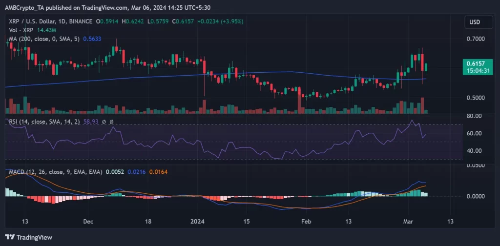 El 5 de marzo, XRP experimentó una notable caída de precios, como reveló un análisis gráfico diario. El gráfico mostraba el precio comenzando el día de negociación en aproximadamente 0,64 dólares, pero después de una pérdida del 8,6%, cayó a aproximadamente 0,59 dólares.