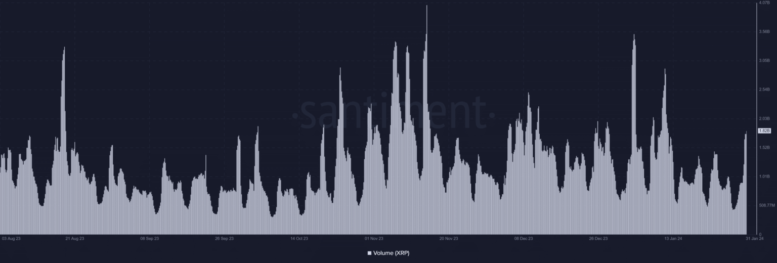 El examen de AMBCrypto del volumen de XRP en Santiment mostró un aumento notable a partir del 28 de enero, coincidiendo con la primera transferencia significativa observada.