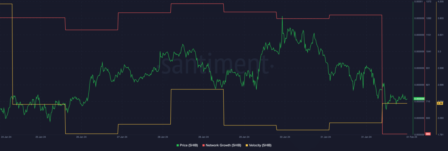 En el momento de esta publicación, SHIB cotizaba a 0,000008888 dólares y su precio había caído un 1,49% en las últimas 24 horas. El crecimiento de la red de SHIB cayó significativamente, lo que demuestra que el interés de las nuevas direcciones en SHIB había disminuido enormemente.