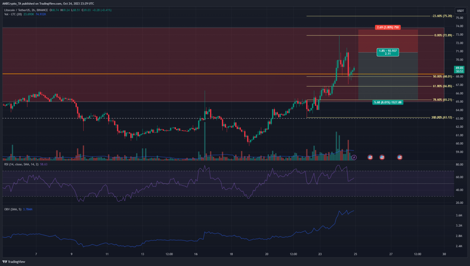 Un informe reciente de AMBCrypto señaló que LTC podría subir a $65 antes de una reversión bajista. Esto no sucedió debido al enorme repunte de BTC, pero la zona de resistencia resaltada de hasta $74 permaneció invicta.