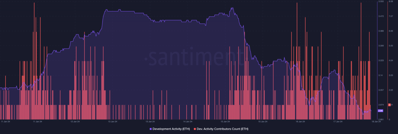 Tras el éxito de la actualización, AMBCrypto comprobó si había habido algún impacto en la actividad de desarrollo. Entre el 15 de enero y el momento de esta edición, la actividad de desarrollo de Ethereum había caído de 3,56 a 2,94.