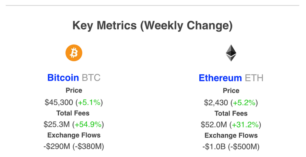 Bitcoin (BTC) también salió de los intercambios centralizados, registrando salidas netas por valor de 300 millones de dólares y rompiendo una tendencia de ocho semanas de entradas a los intercambios. Las tarifas de la red de Bitcoin también aumentaron más del 50% esta semana.