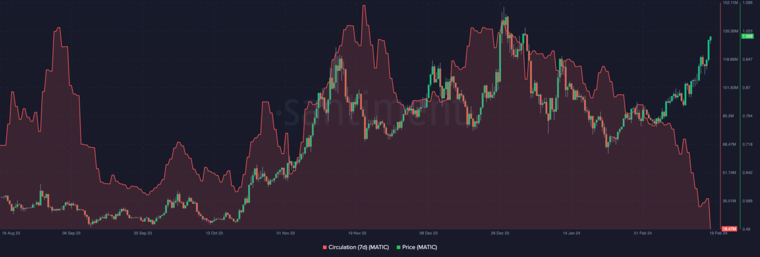 Según el análisis de Santiment realizado por AMBCrypto, la circulación de siete días ha ido disminuyendo desde el 27 de diciembre.