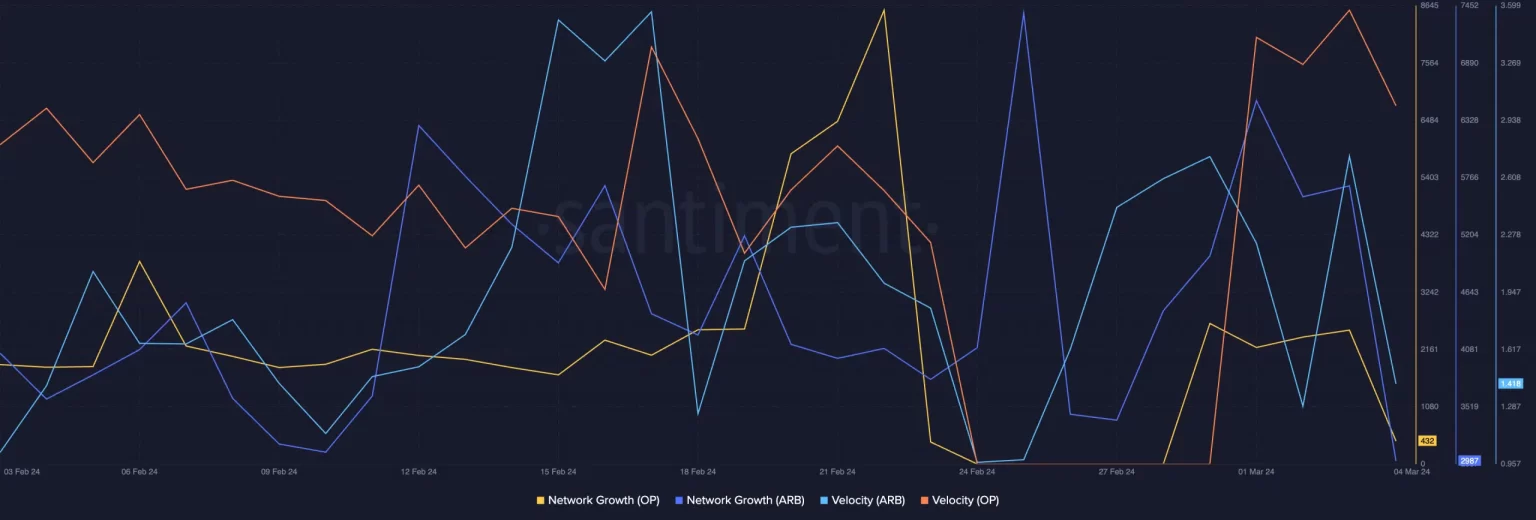 La velocidad, una métrica clave que indica la frecuencia de los movimientos de los tokens, presentó una historia divergente. Mientras que ARB experimentó una disminución en la velocidad, OP experimentó un aumento.