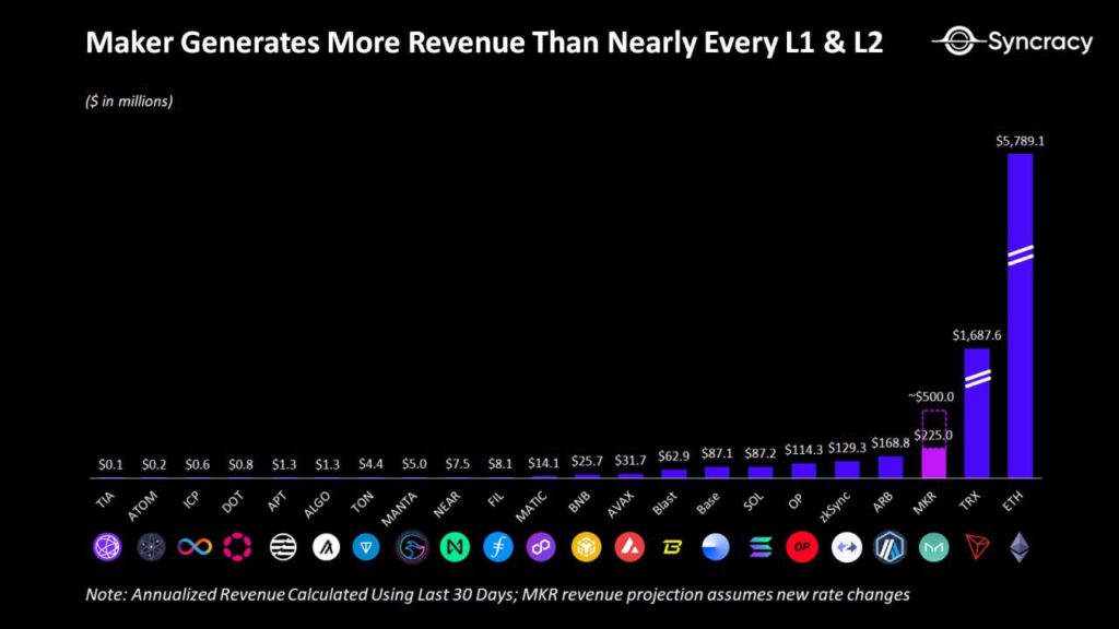 Según datos recientes, los ingresos generados por la red MakerDAO fueron mayores que los de la mayoría de las redes de Capa 1 y Capa 2. Esto es un buen augurio para MakerDAO en muchos frentes.